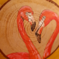 Les flamants roses est une pièce unique réalisée à la main. Elle est née de l’alliance de plusieurs techniques: la pyrogravure et la peinture.