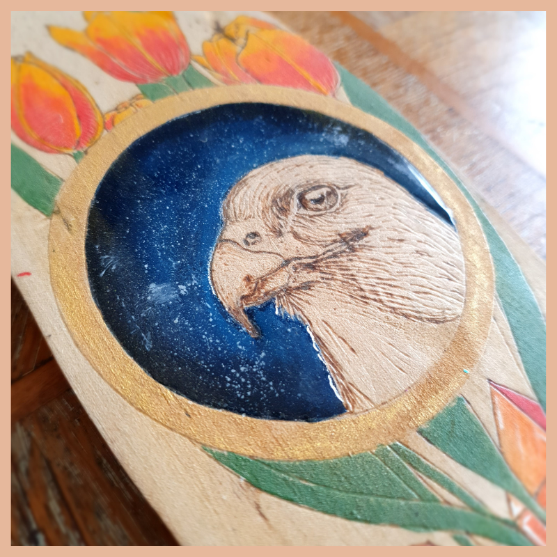 Oculus Faucon est une pièce unique réalisée à la main. Elle est née de l’alliance de plusieurs techniques: la pyrogravure et la peinture.