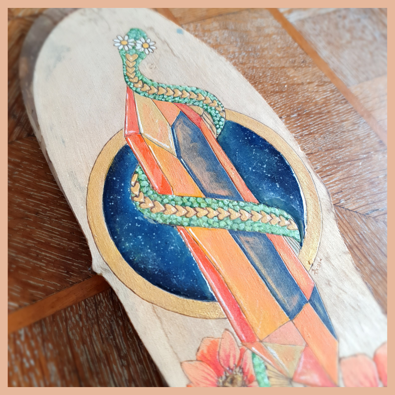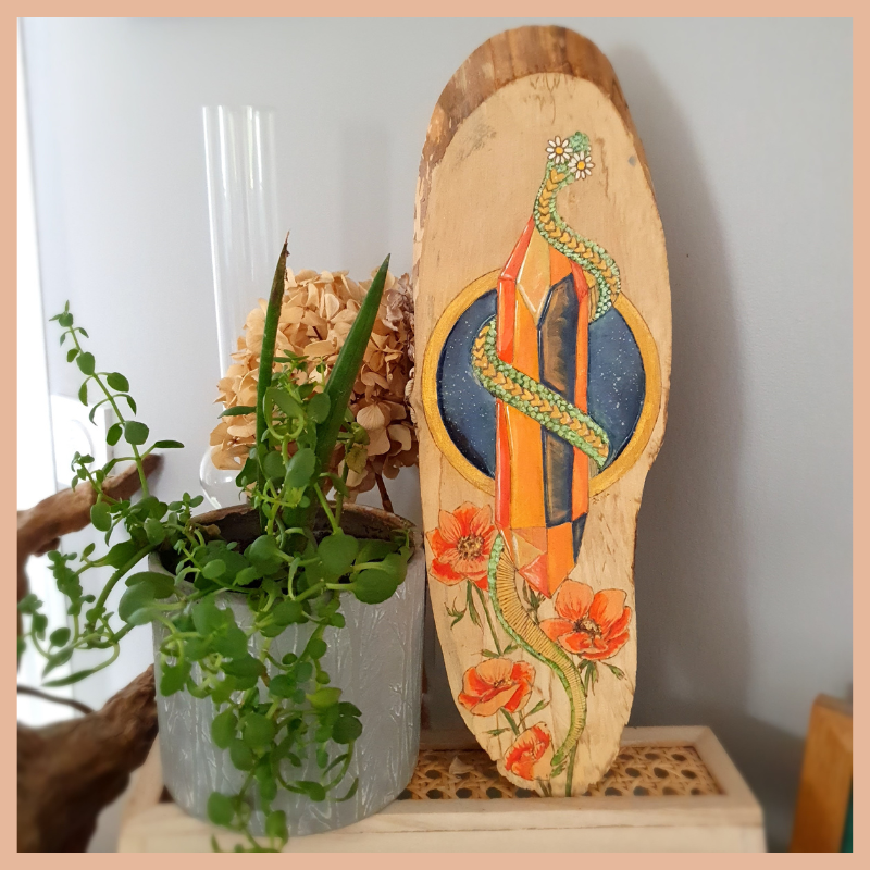 Oculus Serpent est une pièce unique réalisée à la main. Elle est née de l’alliance de plusieurs techniques: la pyrogravure et la peinture.