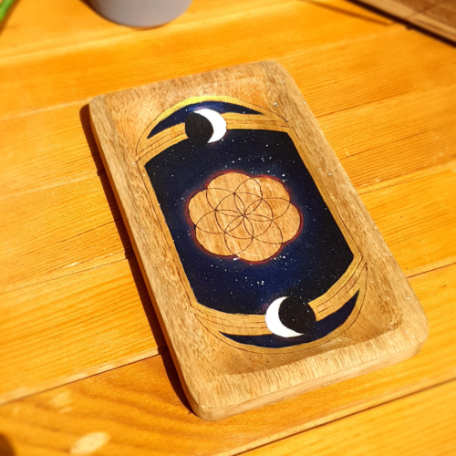 Une création réalisée en pièce unique, qui peut servir de décoration, mais aussi pour recharger tes pierres, redynamiser ton eau ou tout autre chose que tu y poseras. Le plateau fleur de vie est réalisé en pleine conscience avec des intentions positives et beaucoup d’amour. Les motifs sont pyrogravés et peints à la main.