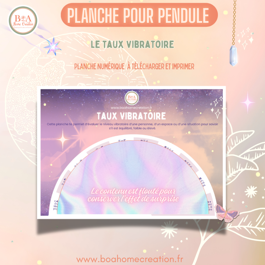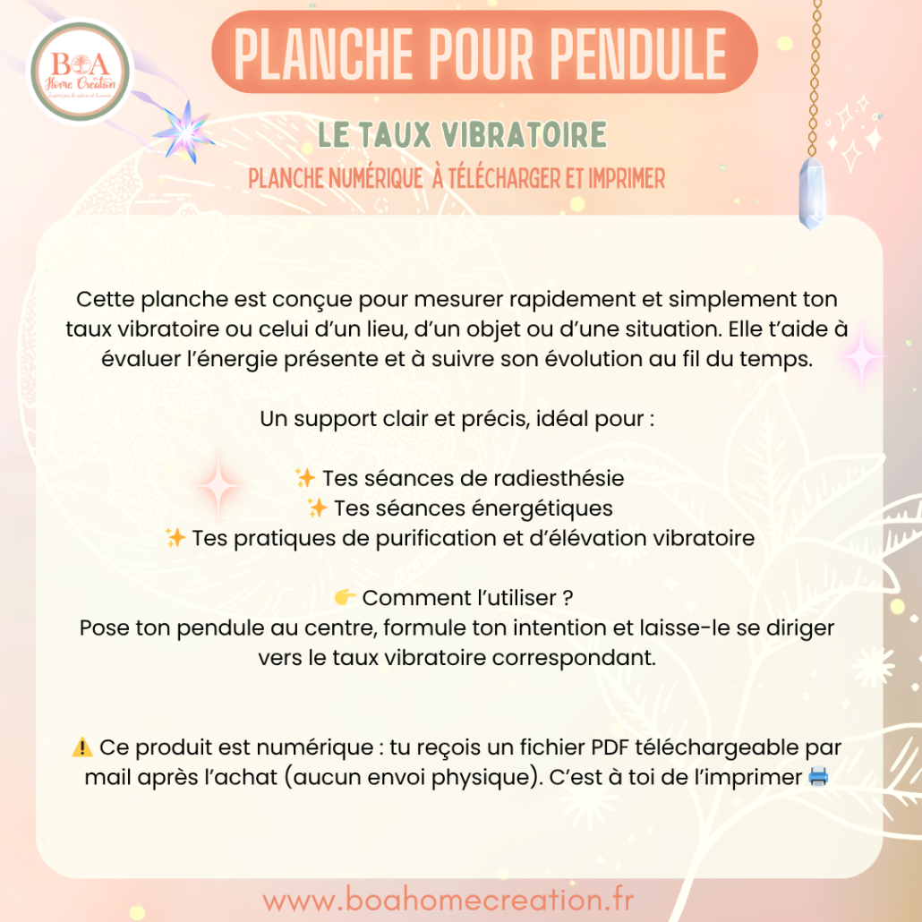 Élève tes pratiques de radiesthésie et tes séances énergétiques avec cette planche unique ! Taux Vibratoire – planche pour pendule est un outil puissant pour détecter, mesurer et harmoniser l’énergie autour de toi, dans ton corps, ton environnement ou tes objets.