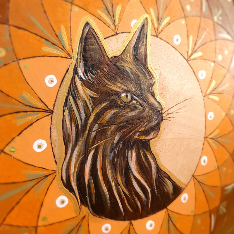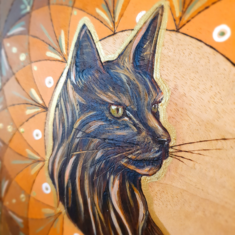 - Géométrie et illustration pyrogravées et peintes à main levée par mes soins